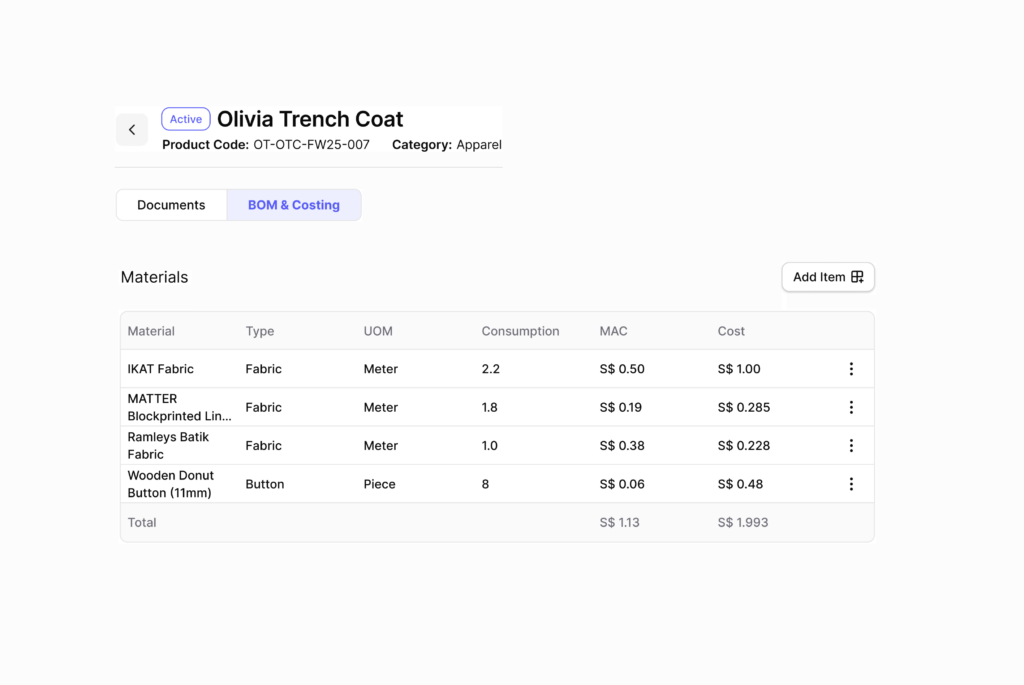 See a complete bill of materials with accurate consumption and cost per component, kept in sync across products and variants.
