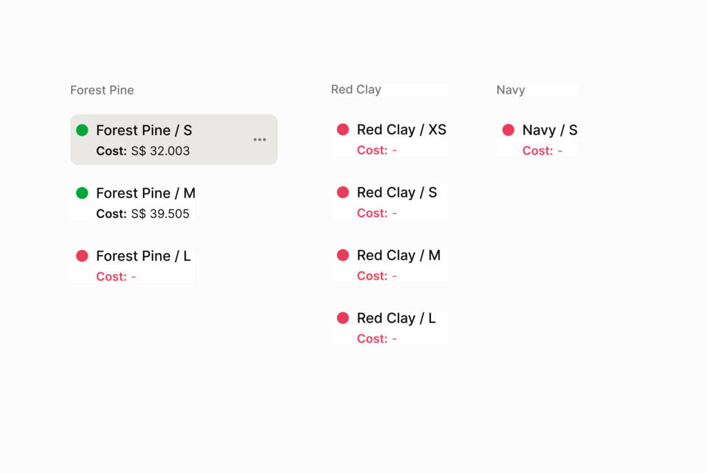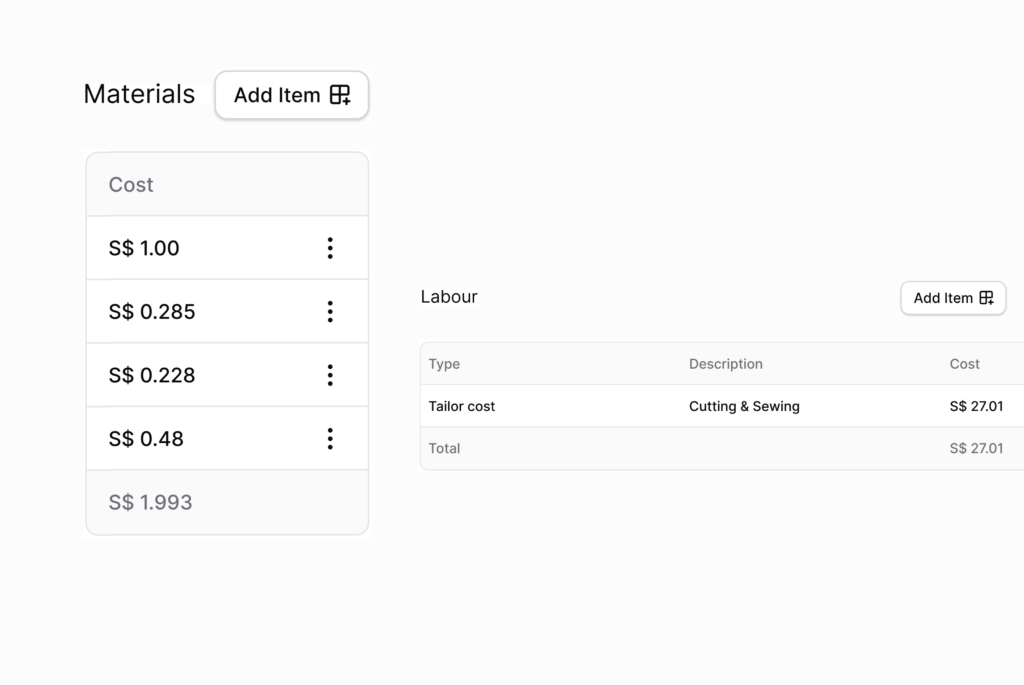 Material quantities and costs update automatically by size, colour, and variant, removing manual calculations and errors.